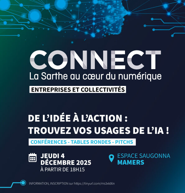 Le Conseil départemental de la Sarthe, en partenariat avec Sarthe Numérique, la Communauté de Communes Maine Saosnois et la CCI Le Mans Sarthe co-organisent une 2ème édition de la manifestation « CONNECT, la Sarthe au cœur du numérique ». Cet événement gratuit, organisé le 4 décembre à Mamers, est ouvert aux entreprises, aux collectivités territoriales et aux professionnels.